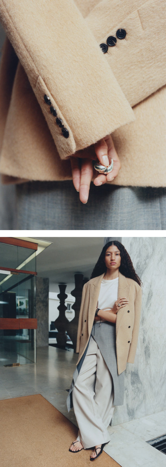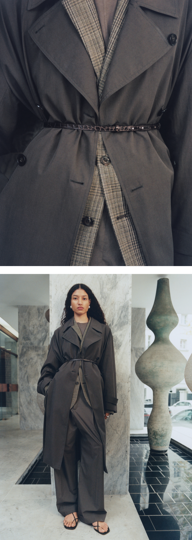 An interplay of jewellery and colourful cords completes the look, while the new sandals hint at the summer styles to come.