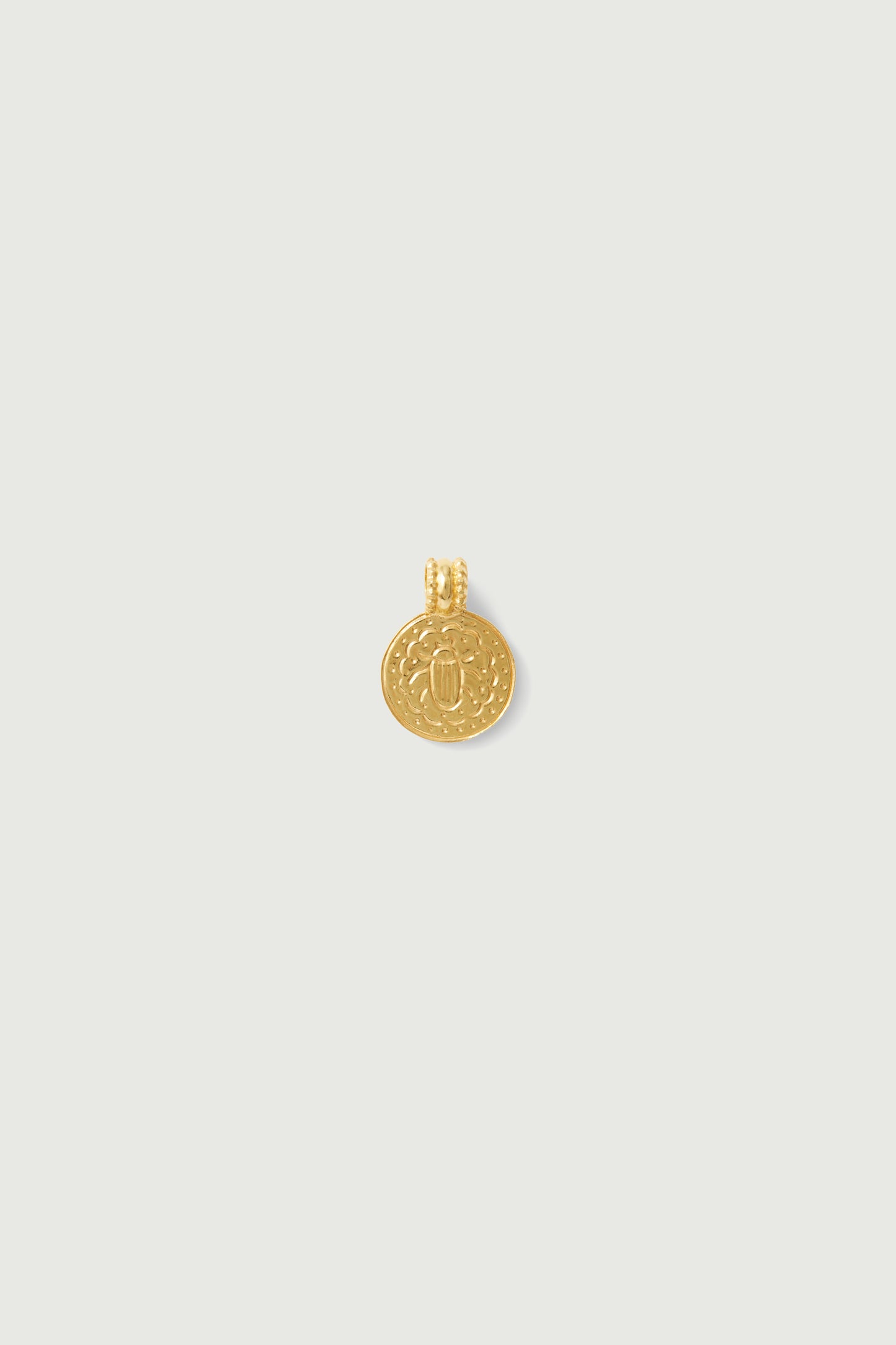 DOMITILLE1 is a round pendant made of vermeil and decorated with a beetle. The motifs inside the medal are engraved by hammering.