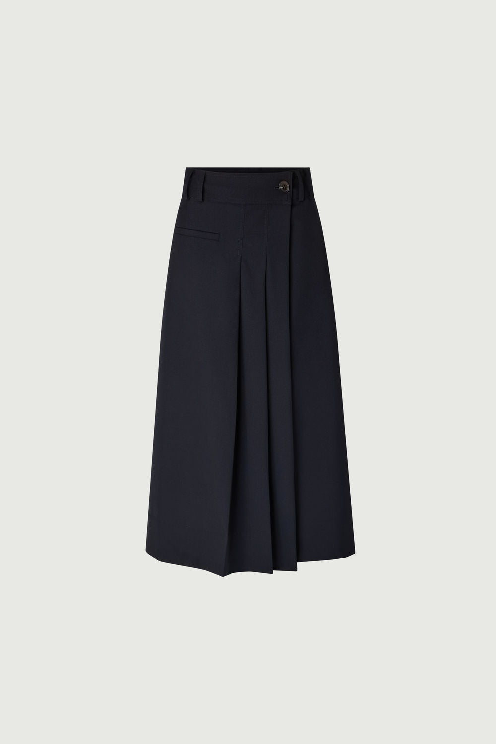 VARNA is a navy woollen canvas skirt. Inspired by traditional kilt style, this skirt is distinguished by its meticulously crafted front pleats, creating a fluid and refined movement.