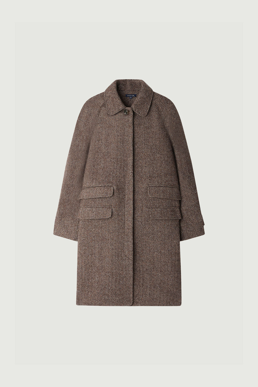 SIMBA is a herringbone wool blend coat. With raglan sleeves and bent elbows, it combines comfort and style. The classic collar and hidden button placket add a touch of refinement. Featuring four practical flap pockets and buttoned fastening tabs at the cuffs, SIMBA in buttoned wool is both functional and sophisticated.