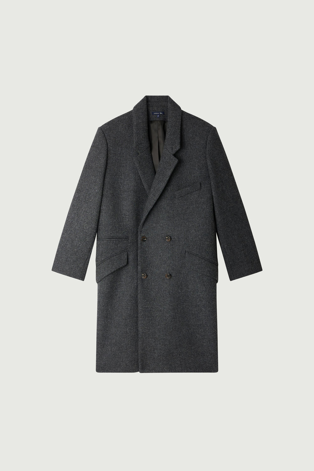 WADDEN is a mid-length coat in mottled grey double tweed. Designed with a straight fit for a sleek silhouette, it captivates with its timeless masculine look. Featuring an elegant tailored collar and a front button placket, it combines style, sophistication, and modernity.