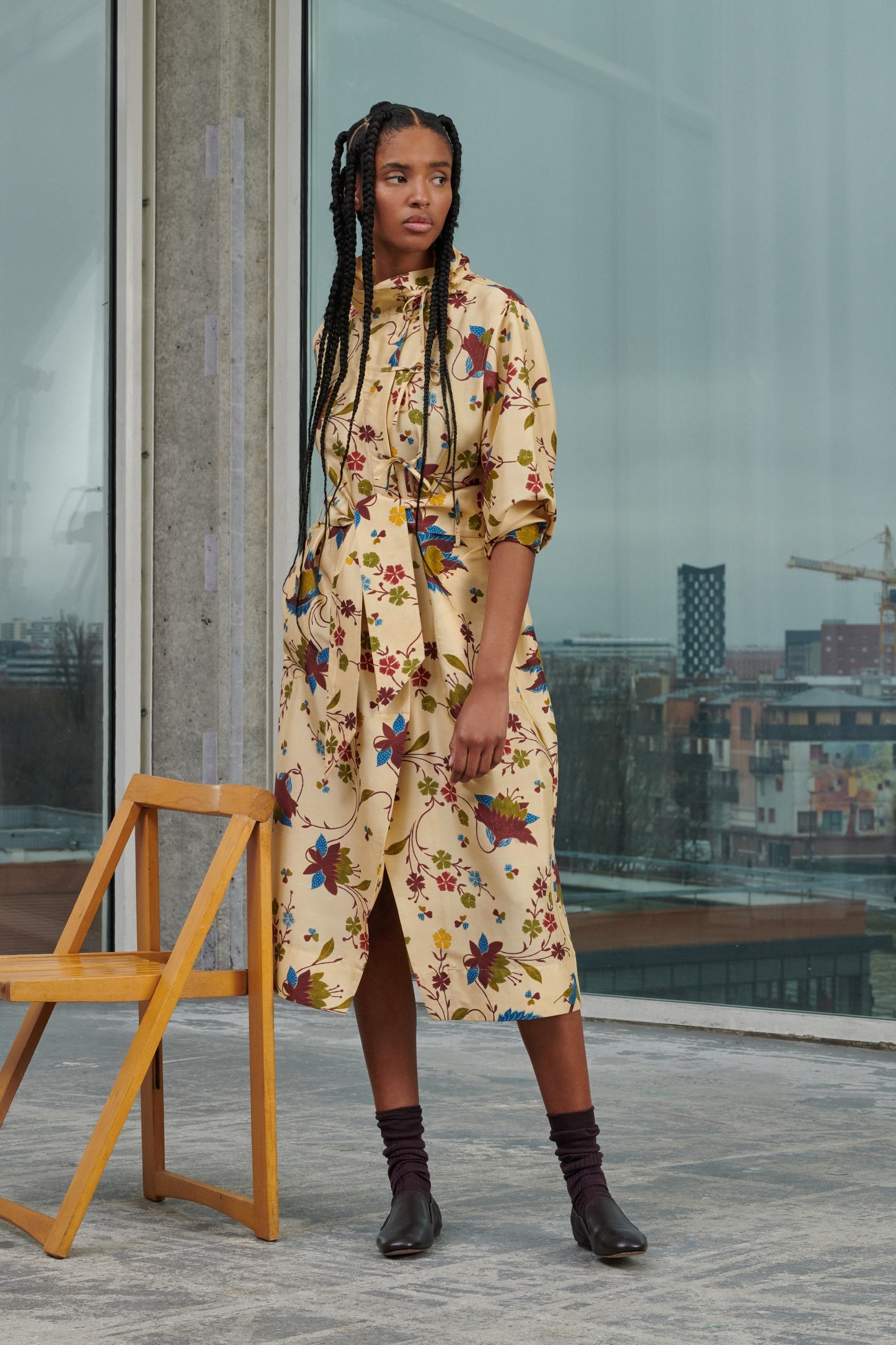 Dress with ties in printed silk doupion multico off-white